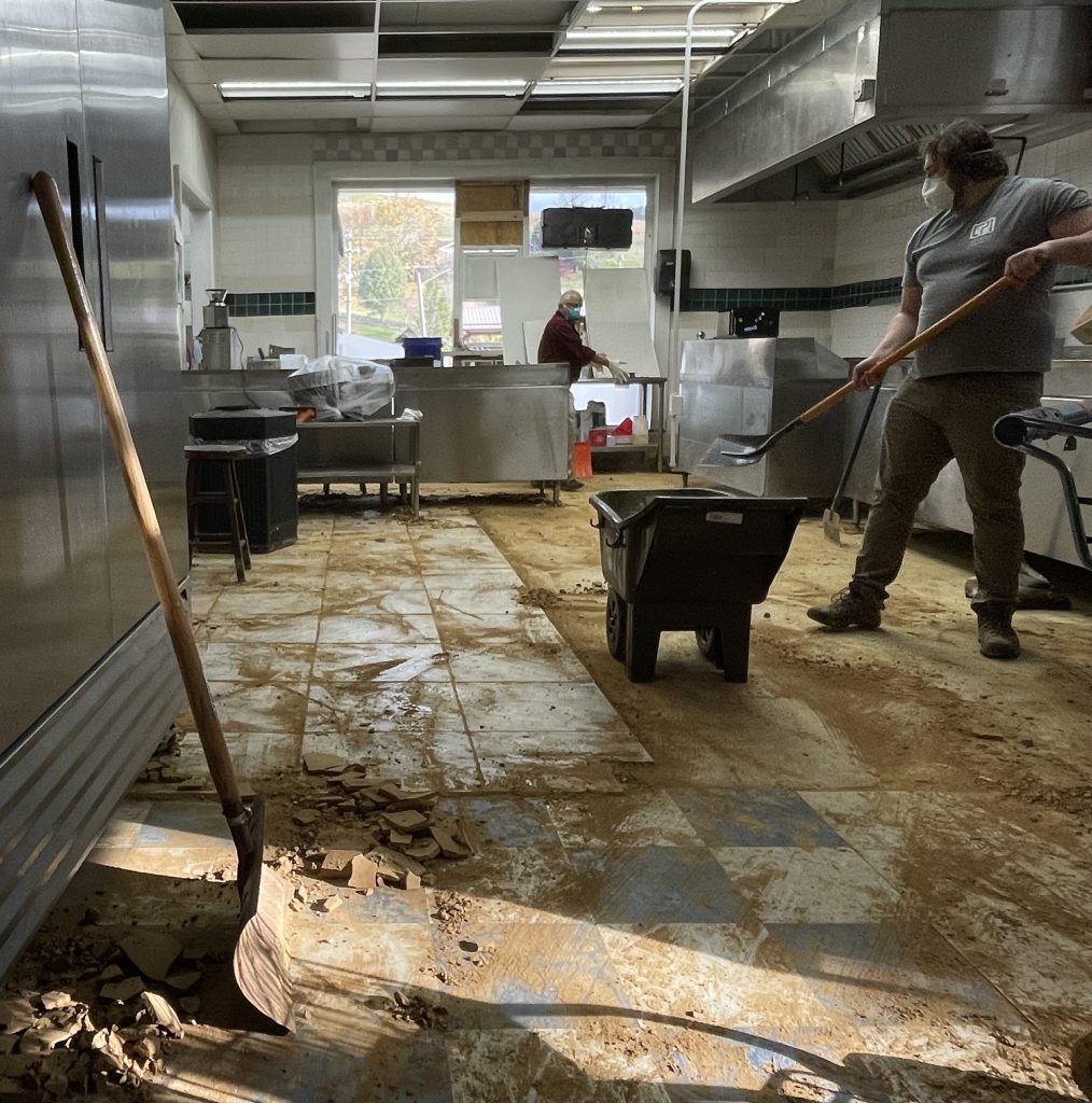 Volunteers help clean up GB’s Spice House, a Watauga County restaurant that has not reopened. Photo by Lou Murrey